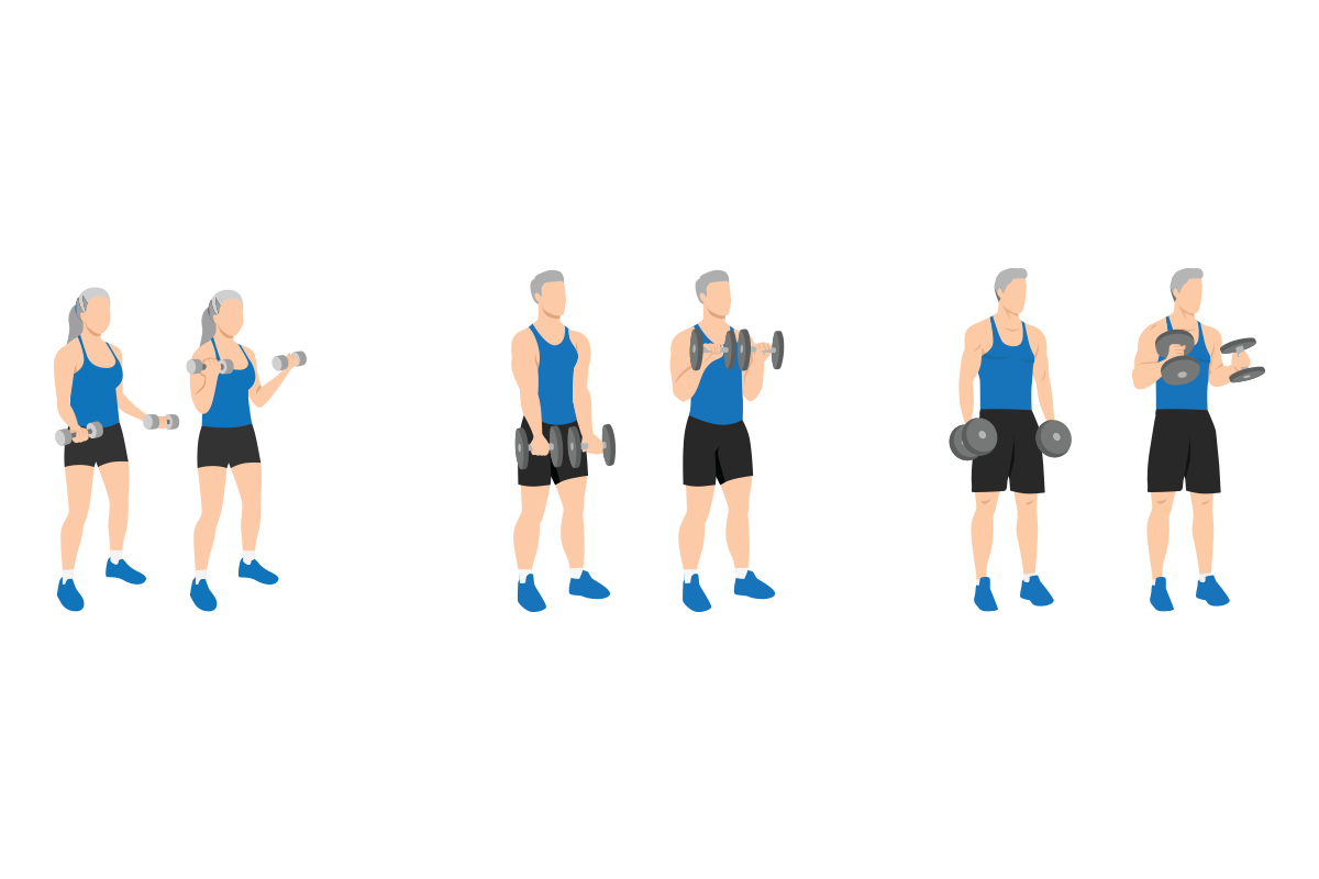 - Slowly bend your elbow to curl the dumbbells up to your shoulders. Don’t bend your wrist.