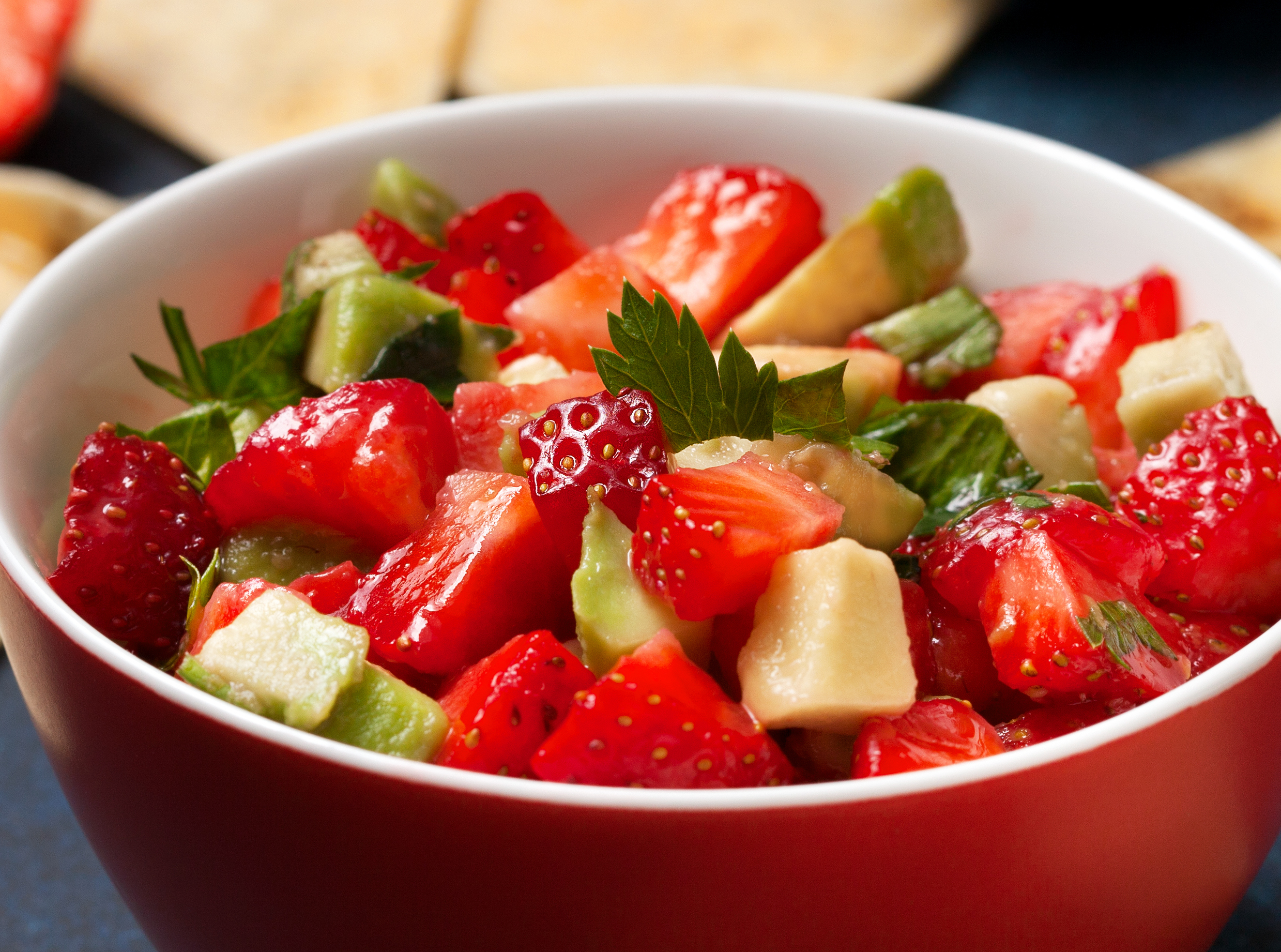 2. Chop strawberries, avocado, jalapeño and cilantro, add to medium bowl.