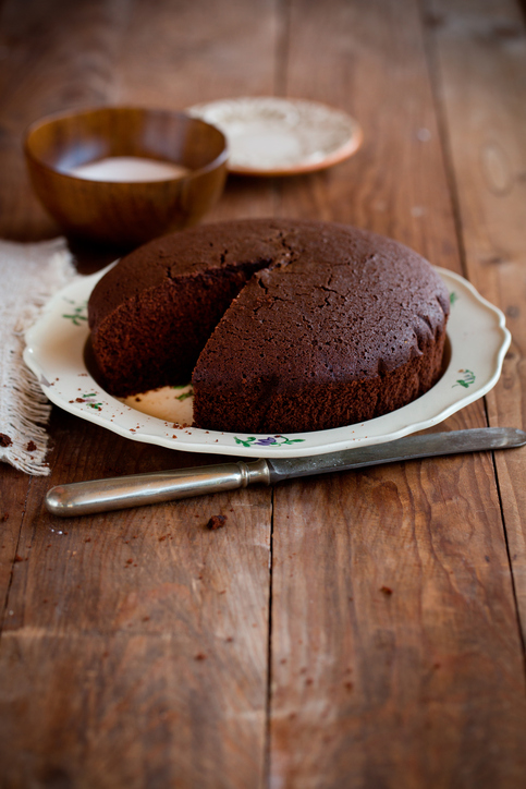 4. Using rubber spatula, fold half of the beaten eggs into the chocolate mixture. Fold in remaining eggs, scraping bottom and sides of bowl, until no streaks of egg remain. Pour batter into prepared pan. Place foil-wrapped pan in a larger pan with 1 inch of hot water to create a water bath. Loosely cover the pan with a piece of aluminum foil. Bake in oven 12 minutes and remove from oven to cool on wire rack. (The cake will not look done but will set as it cools.) Cool on wire rack at least 45 minutes. Refrigerate at least 3 hours. Serve cool or at room temperature.