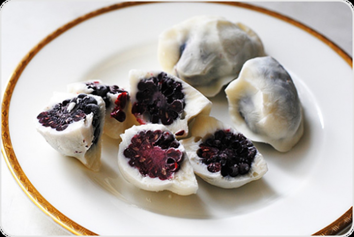 - Whisk together Greek yogurt and honey in a large bowl. Individually dip the berries into the yogurt and transfer to a baking sheet lined with wax paper. Arrange the berries in a single layer. Once they're fully frozen, you can put them in any container you like and they won't stick together. Freeze the dipped fruit for six hours, or until frozen.