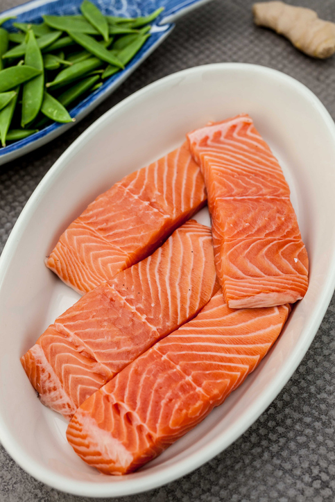 5. Wash the salmon and pat it dry. Pour the reserved chile mixture into the remaining prepared baking dish and place the fish skin-side up into the dish. Bake for 8 minutes. (Vegetables will continue to roast on a separate rack.)