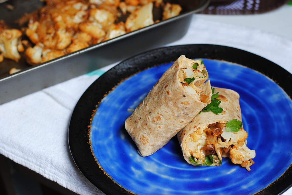 Roasted eggplant and cauliflower wraps